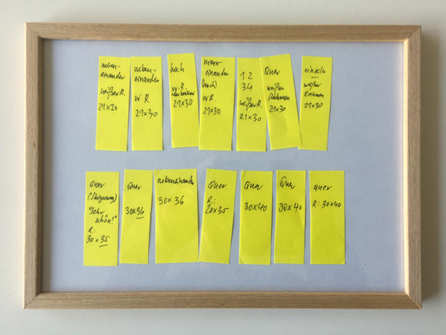 NEBENEINANDER, HOCH, QUER, 2024, Notiz-Klebestreifen auf Papier – gerahmt 30 x 21 x 1 cm