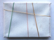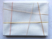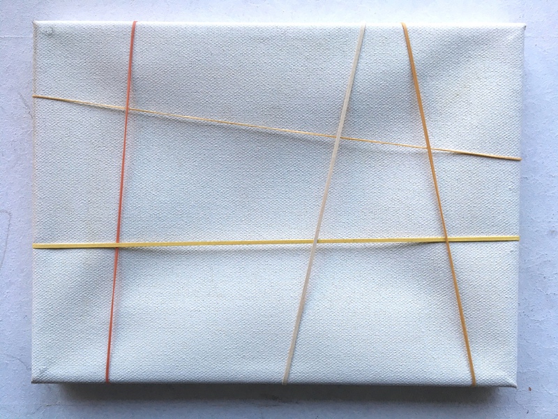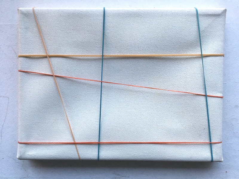 GUMMIBILD 1-3, 2025, Gummibänder auf Leinwand, je 20 x 30 cm
